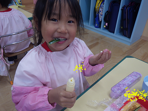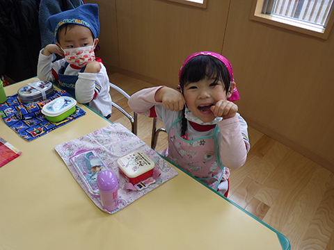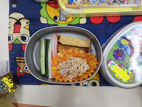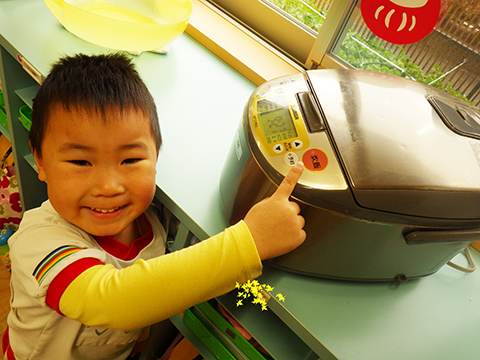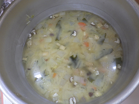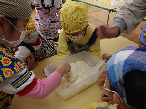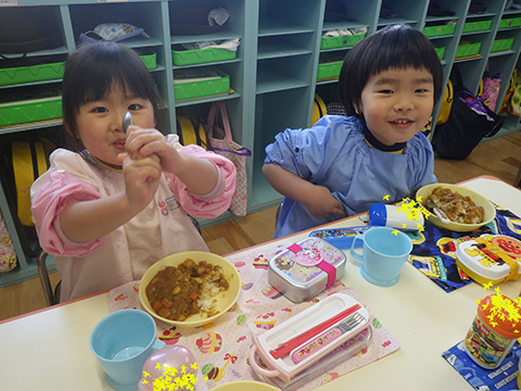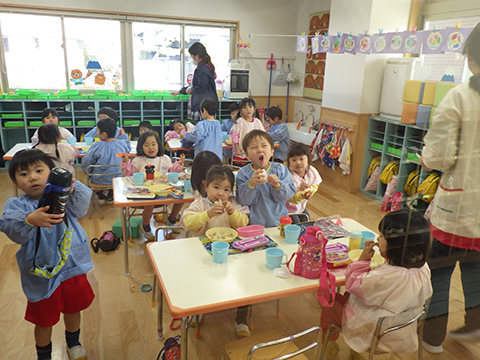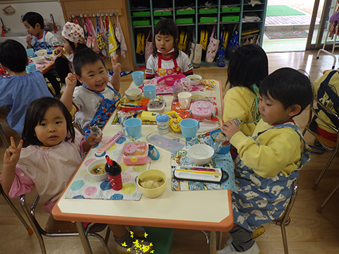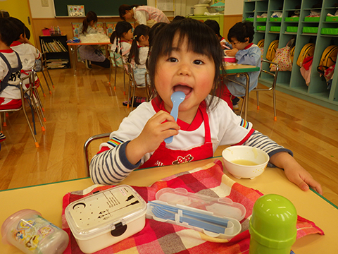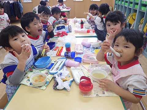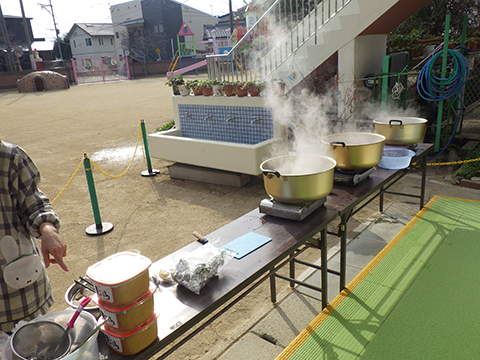 おゆうぎ室で食べている間にみそ汁も完成