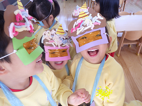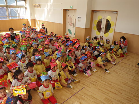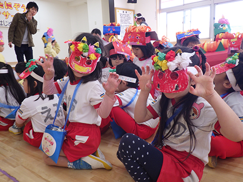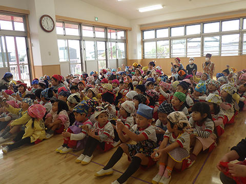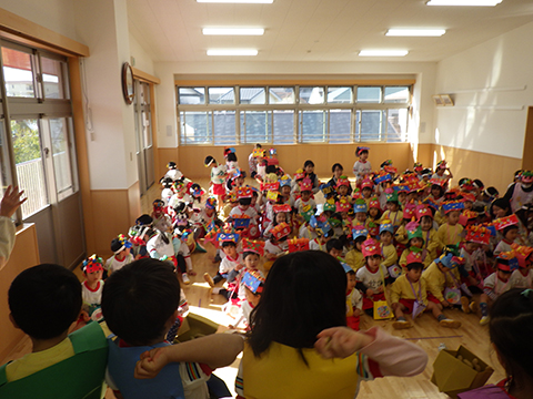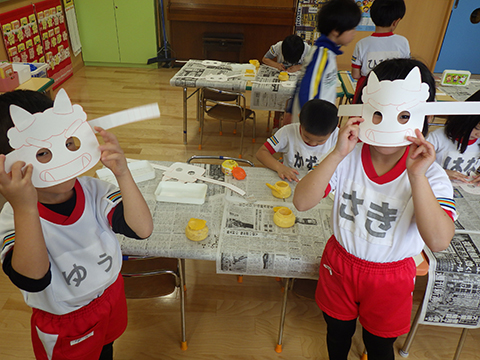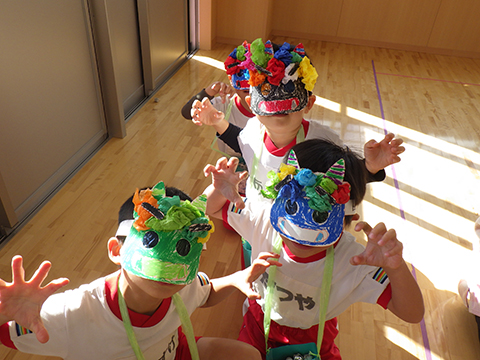 おゆうぎ室では全園児がお面を被って準備万端!
