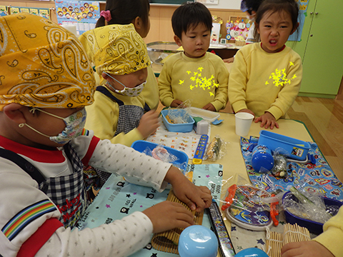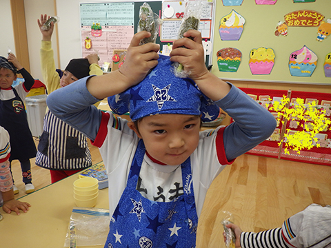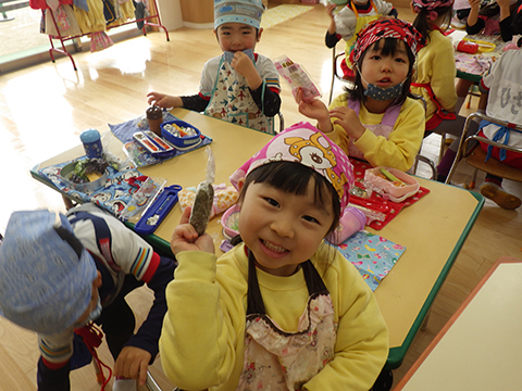 できあがった恵方巻きを持って、おゆうぎ室へ集合!