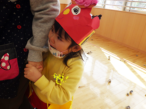 大騒ぎのおゆうぎ室でしたが、必死に豆を投げた結果、鬼は退散