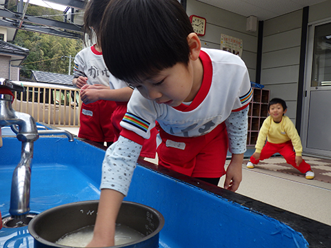 「つめたくない?」「さむいね〜」と言いながらの米研ぎ