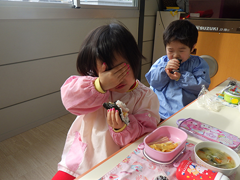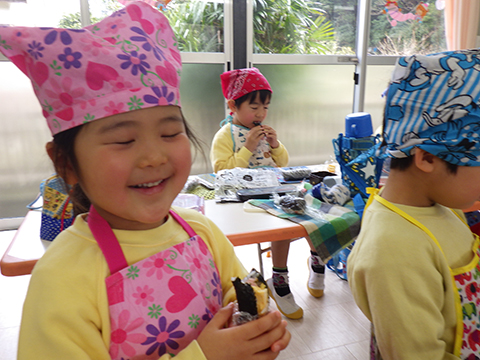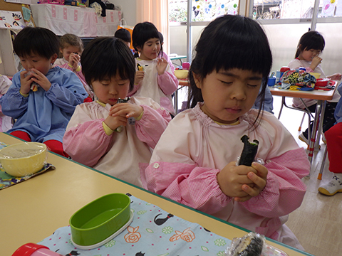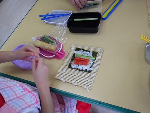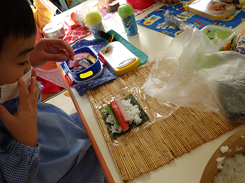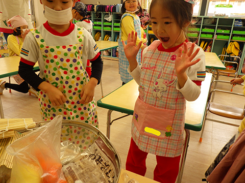 みそ汁はキッチンの先生たちに任せて、今度は恵方巻き作り