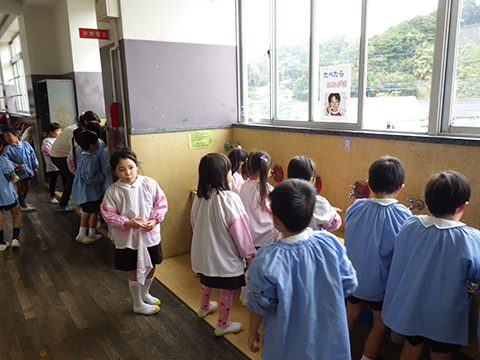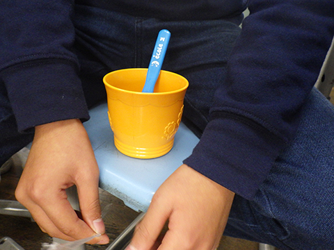小学生は給食の際、歯ブラシとコップを机に置いていますが・・