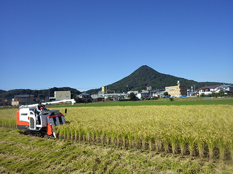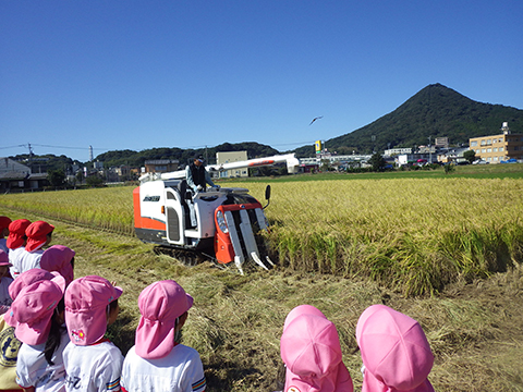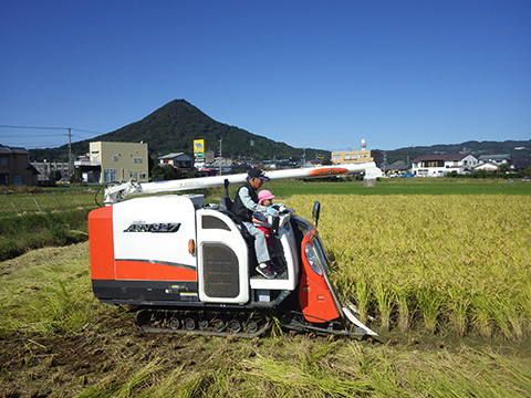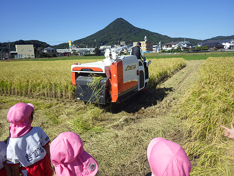 ちょうどタイミングよく、コンバインで稲刈り中