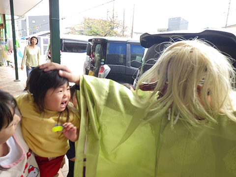 おゆうぎ室には、頭が爆発した博士と桃太郎とスーパーサイヤ人!
