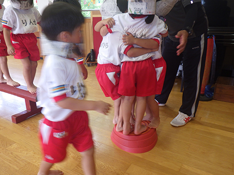 グループのみんなで協力して小さいブロックの上に