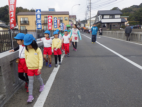 歩行者天国なのに、今年の年長児は端を歩く癖が付いてますので