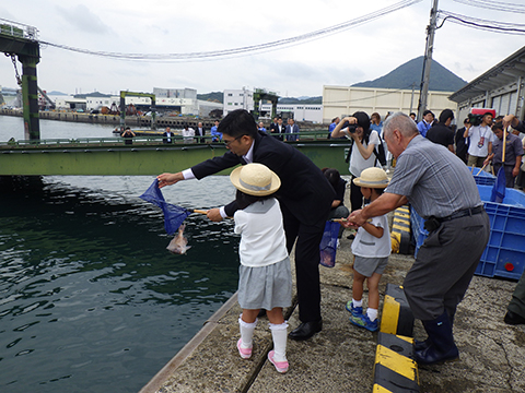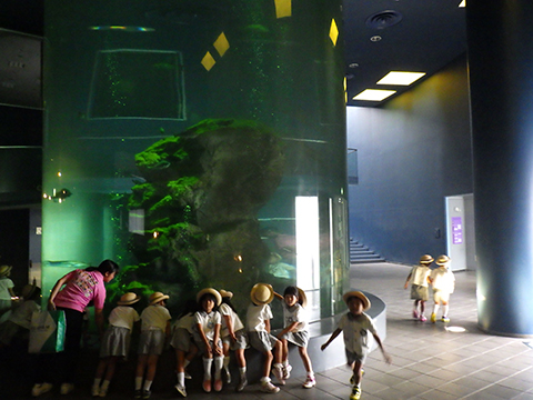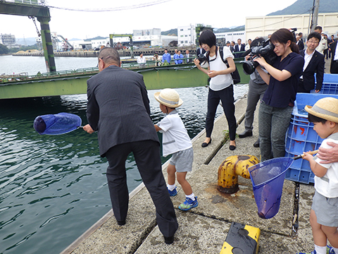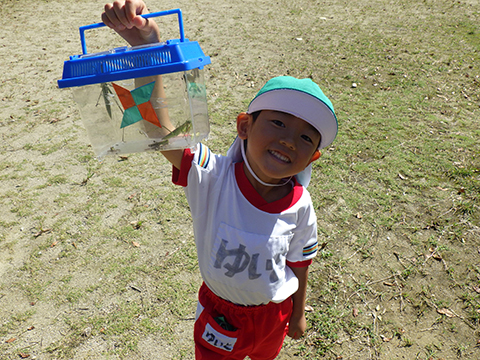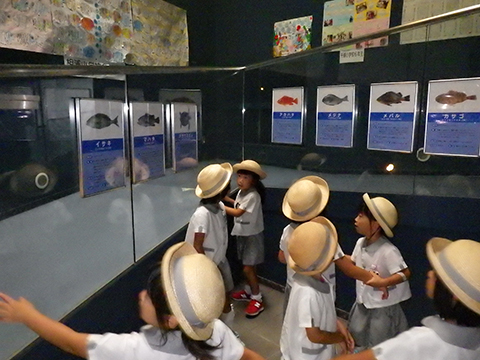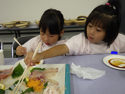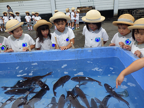 元気過ぎる魚にびっくりしながらも(偉い)大人の人たちと一緒に。