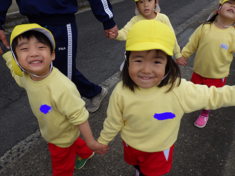 年少児がなんと、先輩たちの手を借りずに自分たちでお散歩へ
