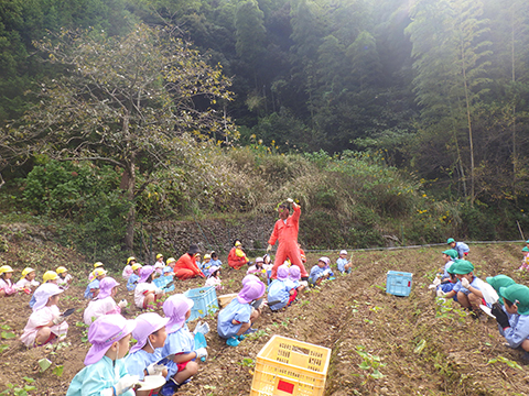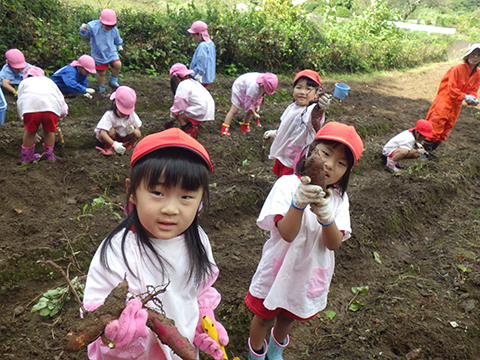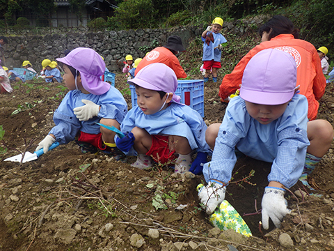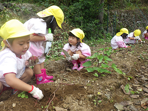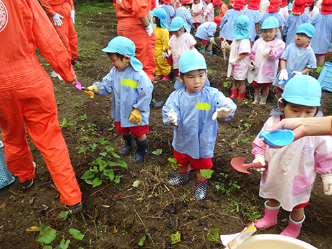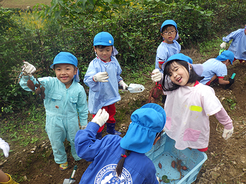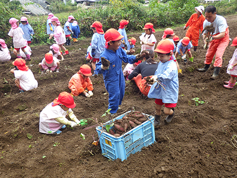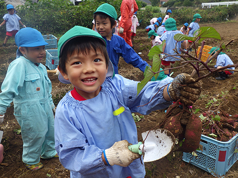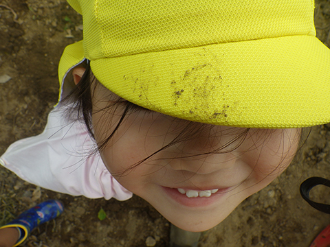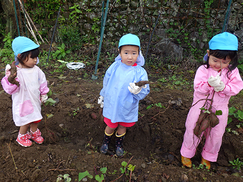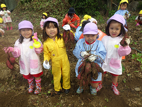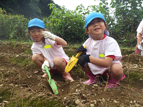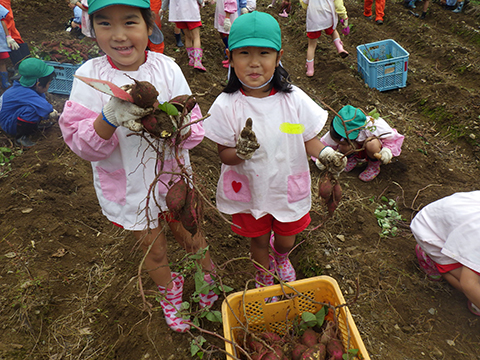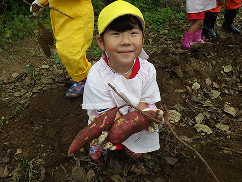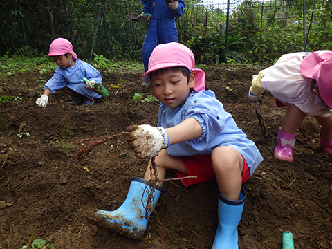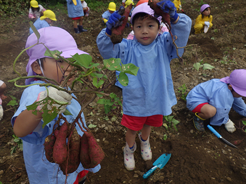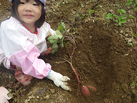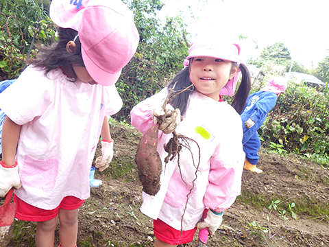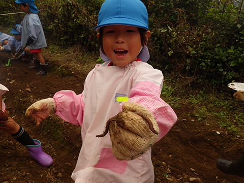 収穫に嬉しさと驚きでちょっと戸惑う年少々児