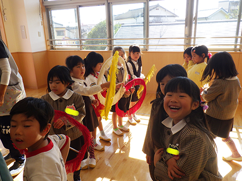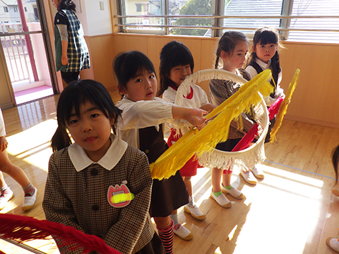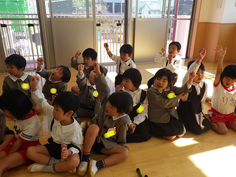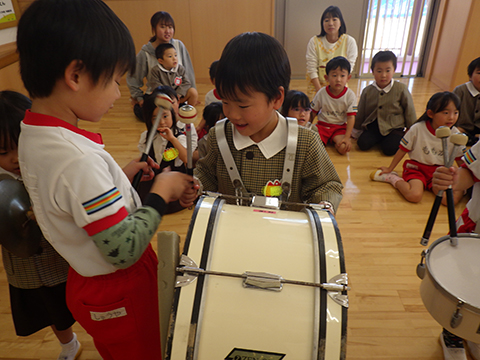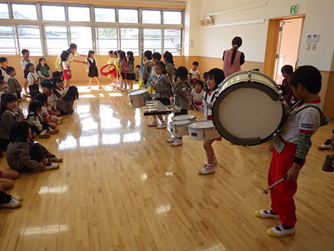 年長児と年中児がおゆうぎ室に集まり楽器の引継ぎ式