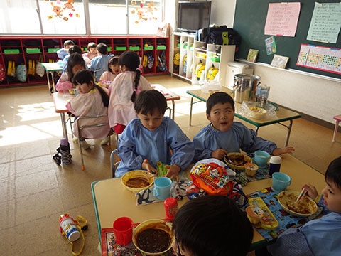 本日の給食は、ハヤシライスでデザートはプリンでした
