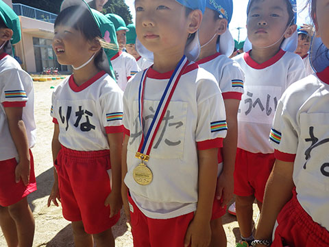 少しドキドキしながらお土産のメダルを首にかけてあげました