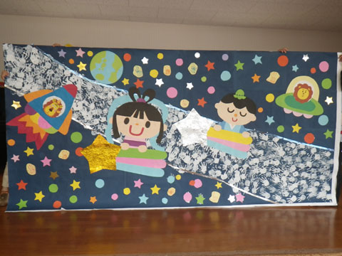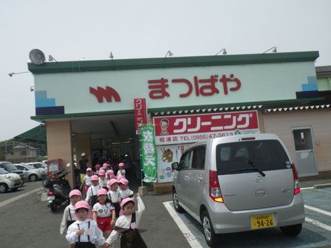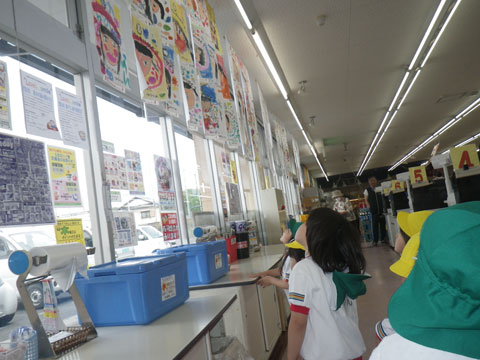 今、近所のスーパー『まつばや』にみんなが描いた力作が展示中