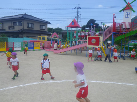 あそんでいる年長児・年少児に「いってきまーす!!」