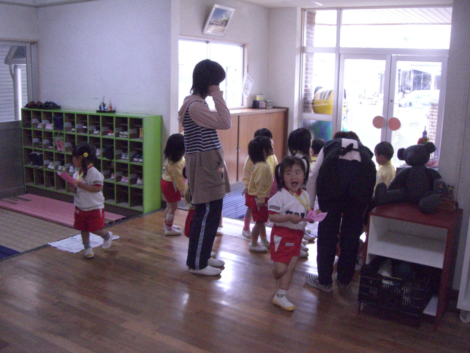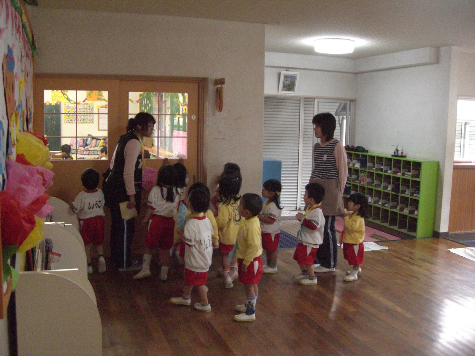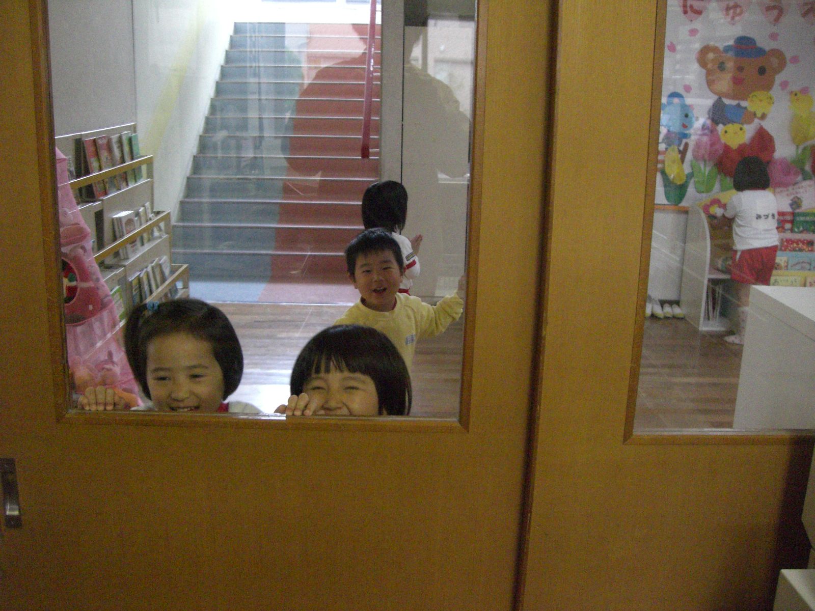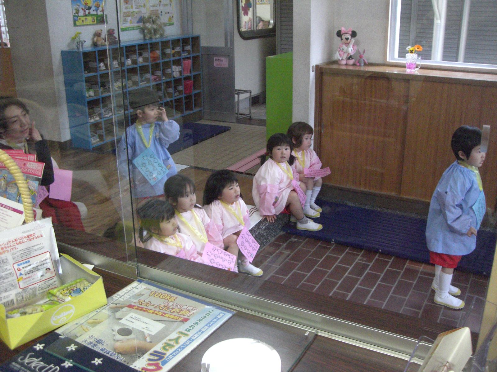 4月16日 今日は年少組のたんぽぽ1・2組のお友だちが 幼稚園の中を見回りました   まずは玄関です    勝手に外へ出てはいけませんよとの先生の言葉に、 元気よく「は〜〜〜〜い!!」と答えてくれました  次は・・・、  もも組のお兄さん・お姉さんが静かにお勉強中でした  <おまけ> 日記を書いている事務室には、いつもこうやって 遊びに来てくれるお友だちがたくさんいます