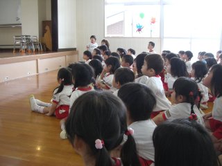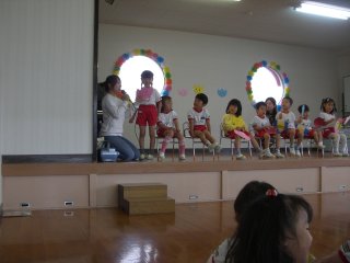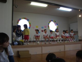 お誕生日のお友だちはステージに上がって、先生の質問や