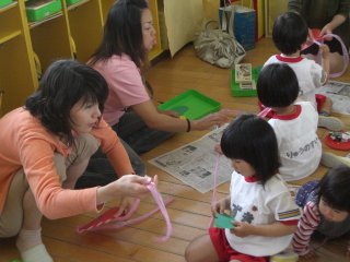 普段の活動の様子を見てもらって完成した作品で一緒に遊んだり、