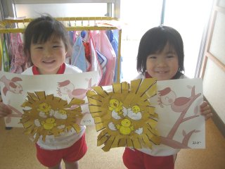 ハサミとのりを使って小鳥の巣を作りました