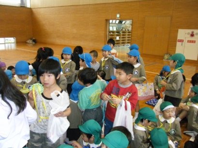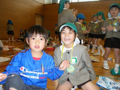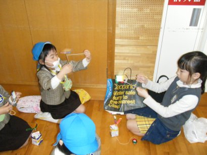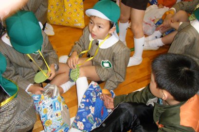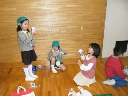 一人ひとりに手作りの名札・ブンブンごま・ピョンピョンかえるなどをもらい