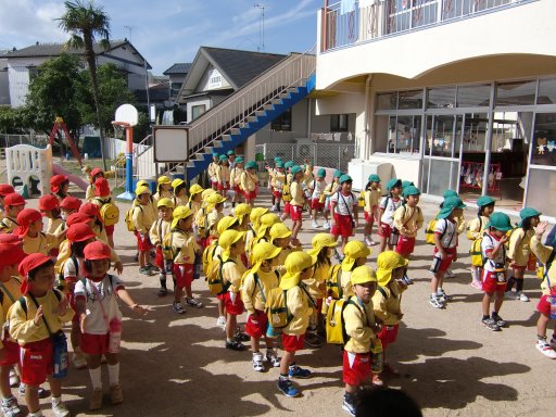 幼稚園に残るお友だちと、先生に大きな声で「いってきます!」