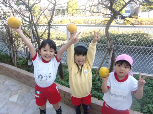 最近は、園庭にたくさんなっているミカン?を採るのが大流行!