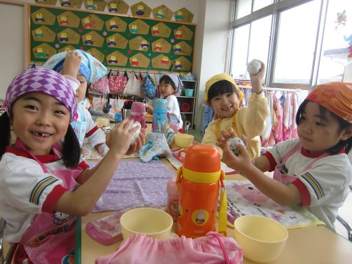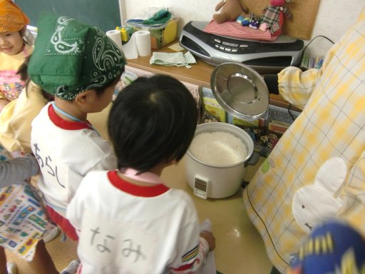 お友だちと一緒に米を研いで、野菜を切って、おにぎりを握って、