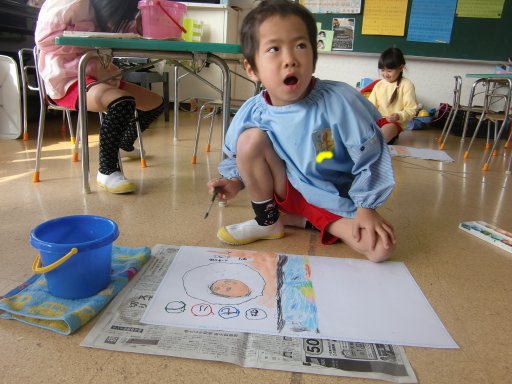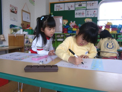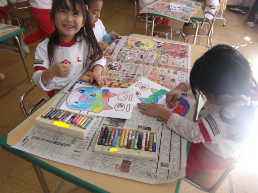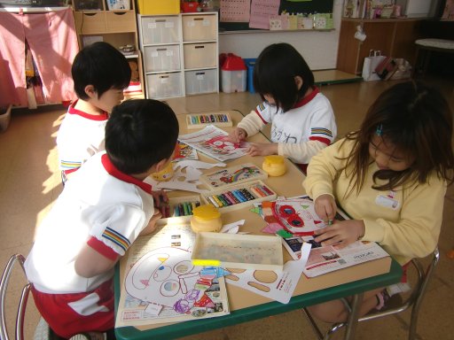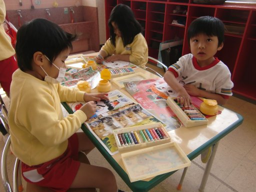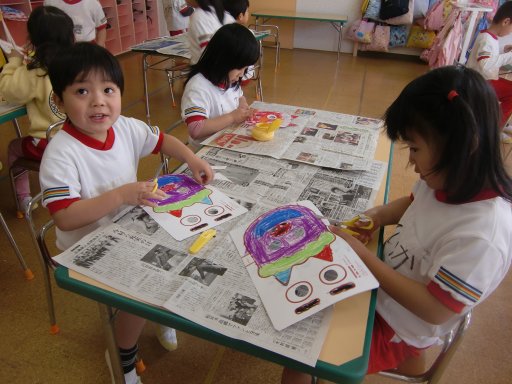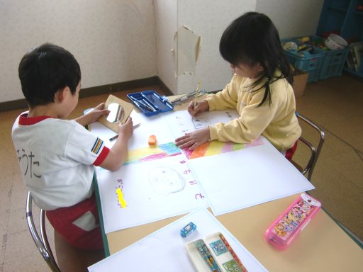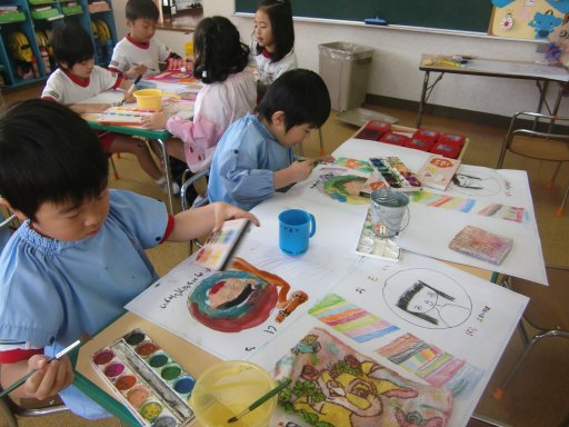 年長組さんがペンや絵の具を使い、熱心に製作活動を