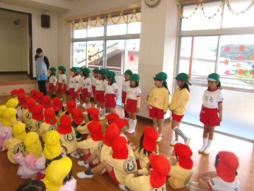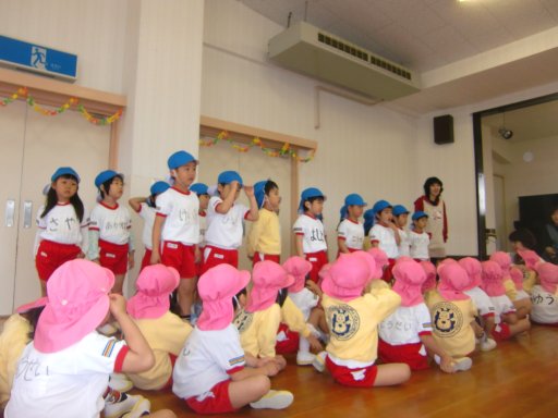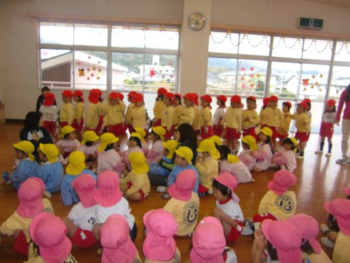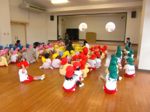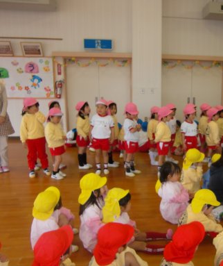 さて今日は、おゆうぎ室にカラー帽子を被ってから!集合
