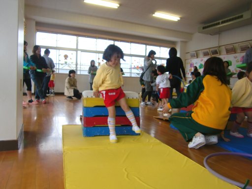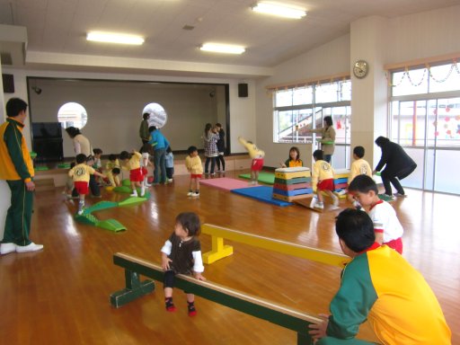 おゆうぎ室には跳び箱やマット、平均台などを準備し