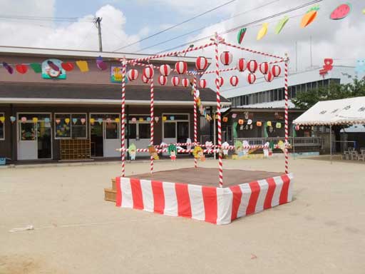 やぐらも組んで、万国旗風なものを飾り付けて・・セッティング完了!