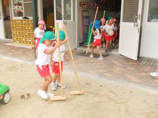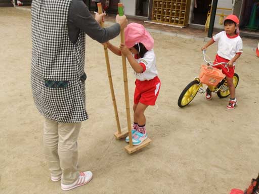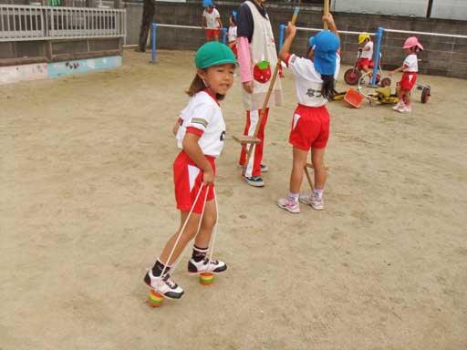 食後、竹馬や缶ポックリ、フラフープを満喫