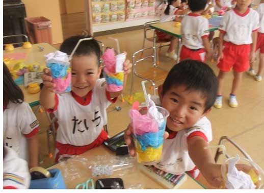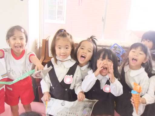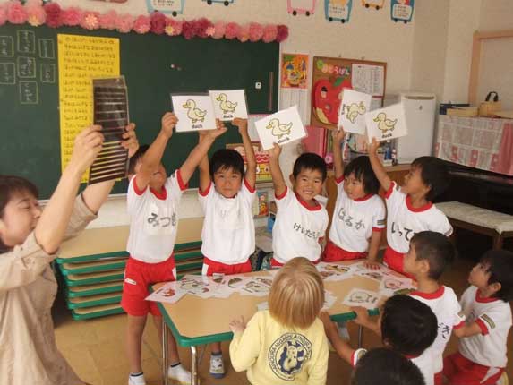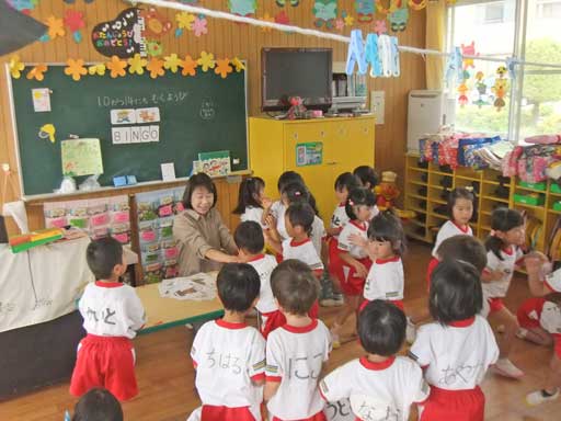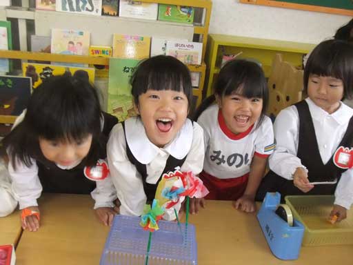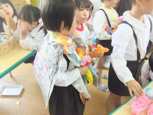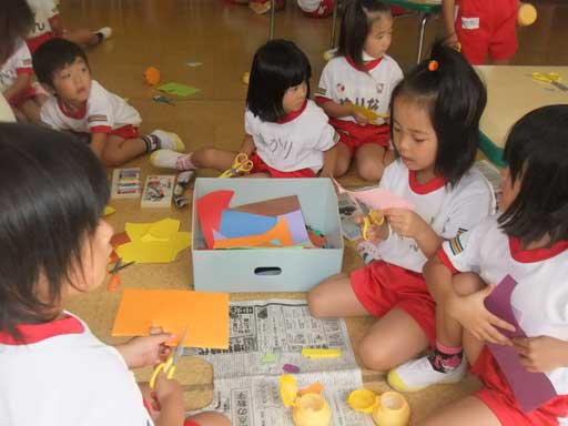 英語教室の前後、教室で何やら製作中の年中組さん