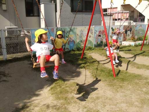 食後の外遊びのときも何かが気になる様子の年少組さん