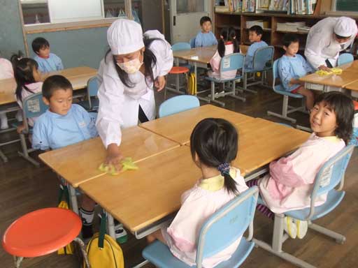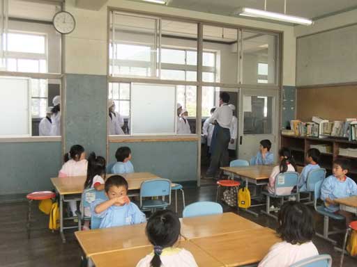給食着に着替えた6年生のお兄さん・お姉さんが続々と