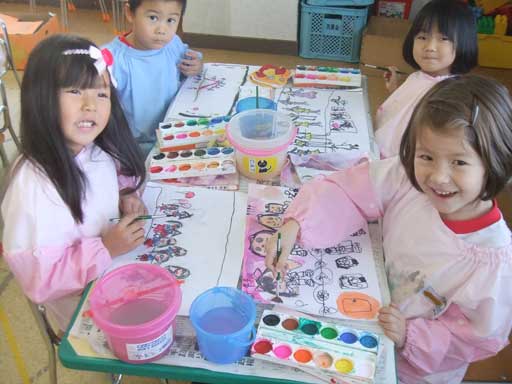 昨日下描きしたおゆうぎ会の絵に色を塗っているんです