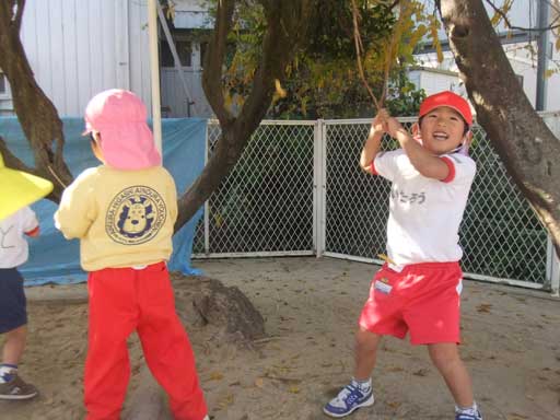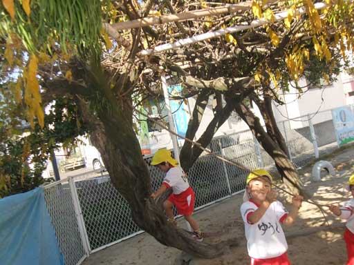 落ち葉が雨の様に降ってくるのが楽しくて、枝をつかんでブンブンブン