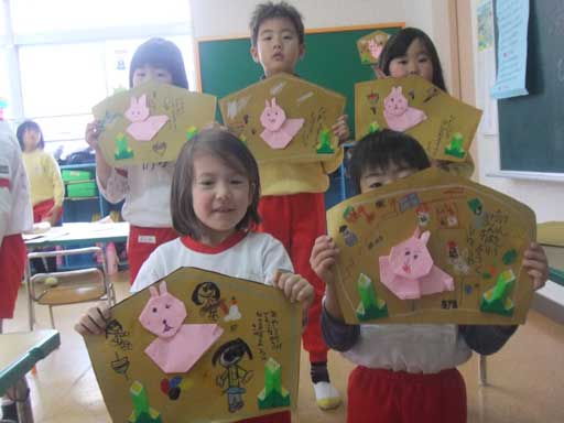 干支にちなんで、「うさぎ」と「門松」を折りました