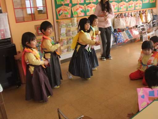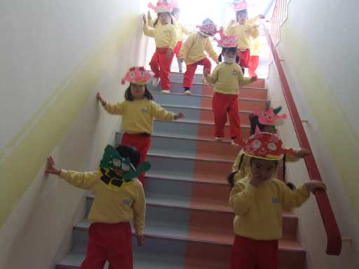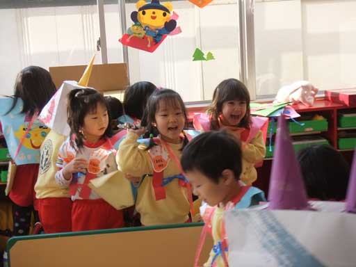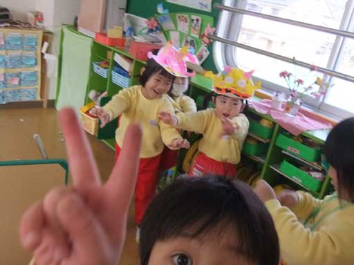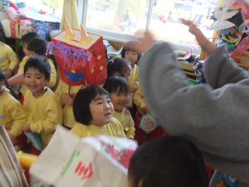 まずは、2月生まれのお友だちが代表で各クラスを回り、豆まきをしてくれました