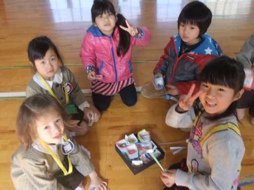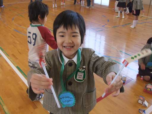 紙とんぼや、牛乳パックけんだま など素敵なおもちゃに子ども達の