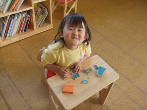 小さな机にパズルを並べ、完成させようと頑張っている姿が
