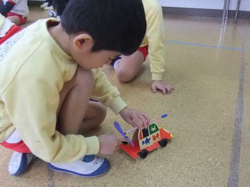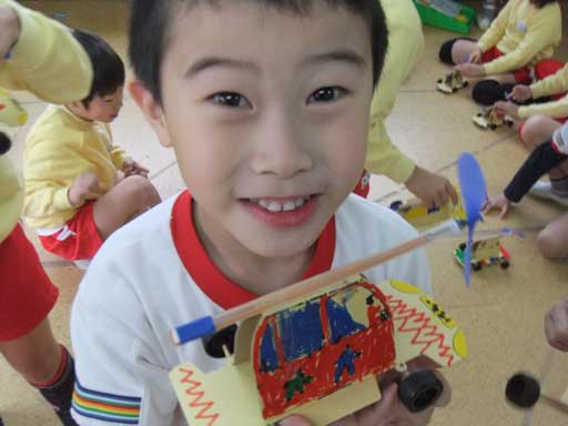 輪ゴムのエネルギーで、プロペラが回って 車がすすむ!!