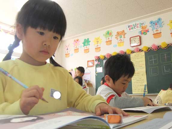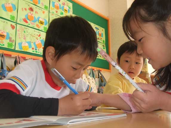 「字が書いてあるところはさわったらシュッてなるけん!」