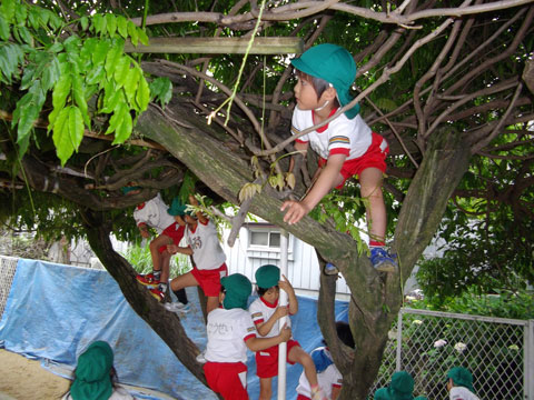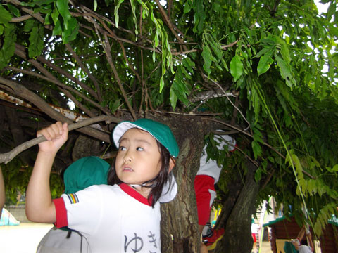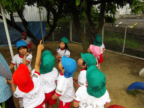 木を見上げ何かに夢中の年長組さん。