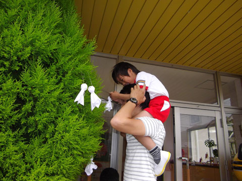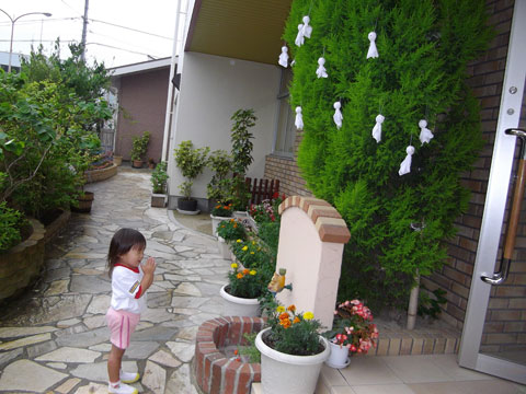 完成したら、玄関の大きな木にぶら下げました
