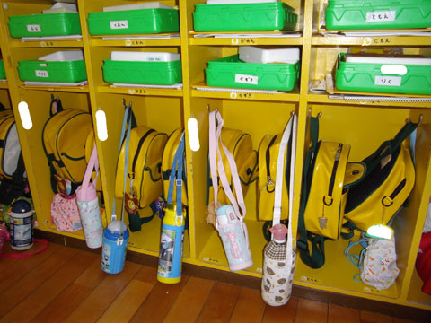 きれいに並べて掛けてあるバッグや水筒。