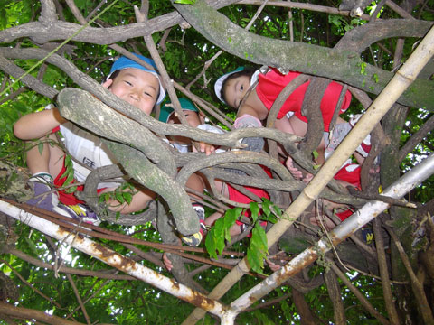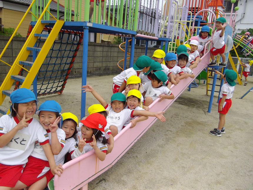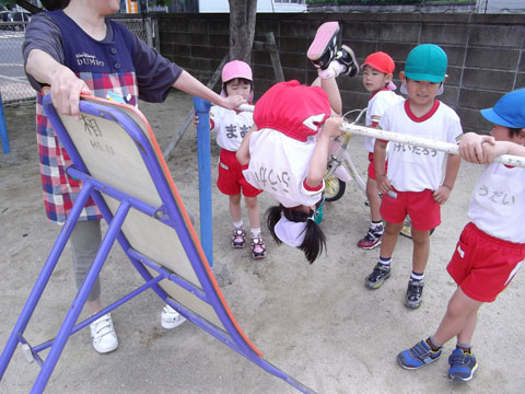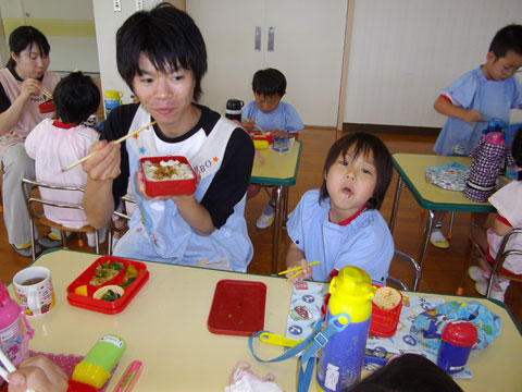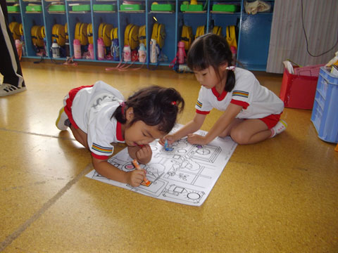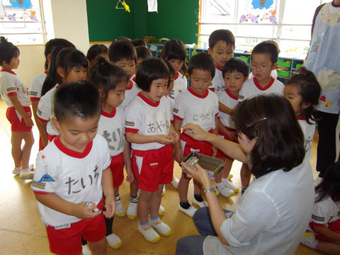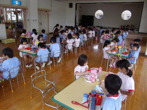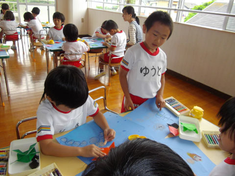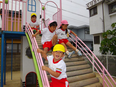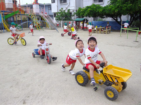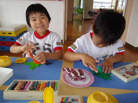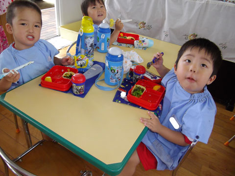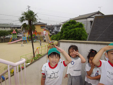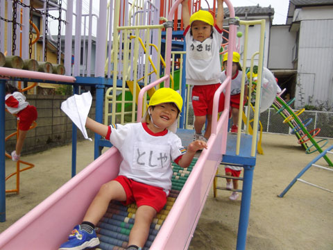年長組さん、明日はプラネタリウムへ行きます  今年から新しくオープンしたところですので、 みんな初めてのところかな  お出かけ時の準備をお願いします! 明日は5・6歳にして初めて?、 “ロマンチックな気持ち”を持ち帰ってくる予定です  明日からまた天気が崩れそうな・・   今日のうちにたくさん外で身体を動かしました   そして英語教室ABC   製作も   お出かけしたり、遊んだり、作ったり、勉強したり、 時間の過ぎていくのが早いわけですね  給食    年長組さんはおゆうぎ室で一緒に  食後の外遊びでは、  まだまだ人気継続中の ピーピー豆(仮)の採集や、「レンジャー  」  高速1000円も今度の日曜日で終了ですね! 駆け込み需要の影響か、 当園のローラーすべり台も大渋滞でした