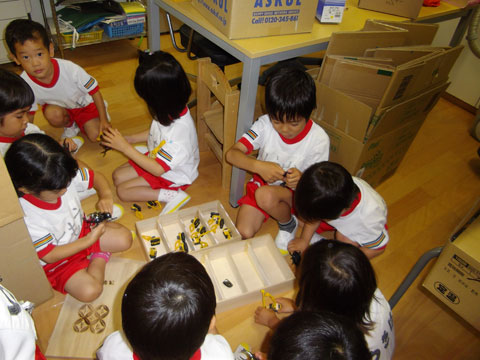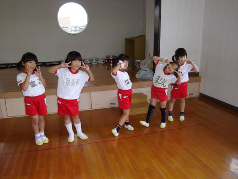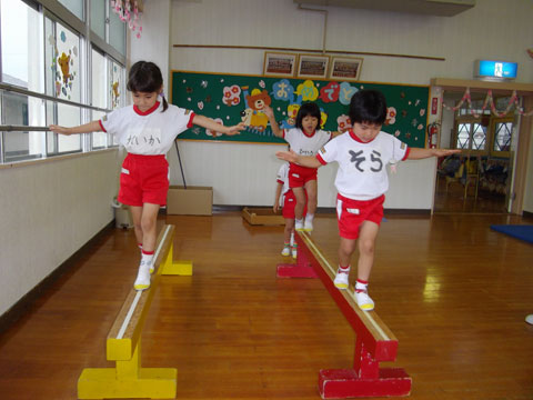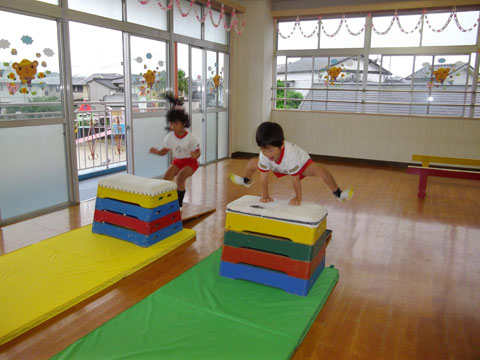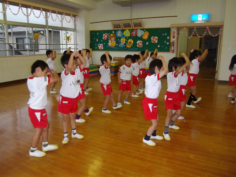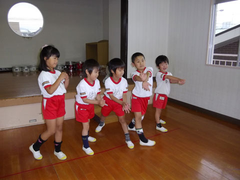 おゆうぎ室では、体操教室に集中しはじめた年長組さんが、