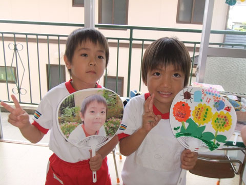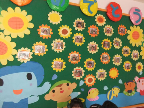 玄関にズラリと7,8月生まれの園児が並んでいます