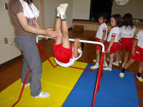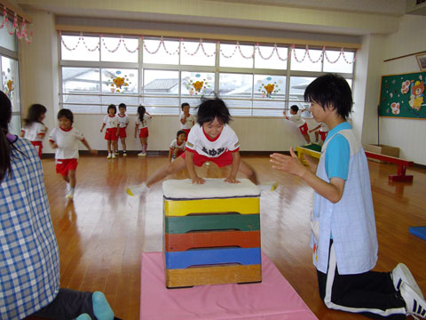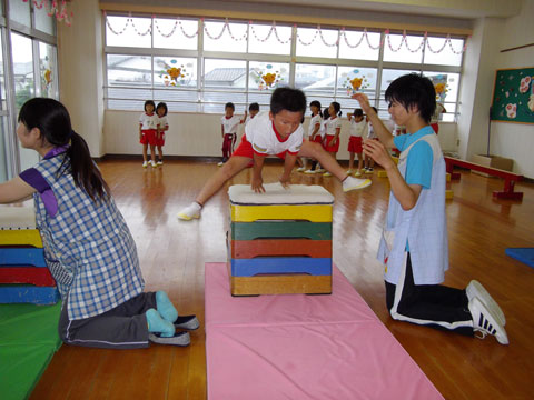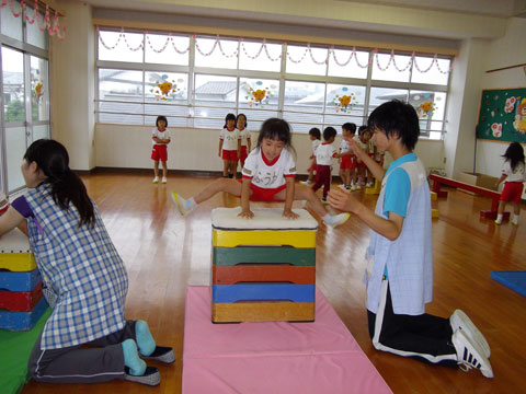 平均台、跳び箱、鉄棒、おゆうぎ室にて